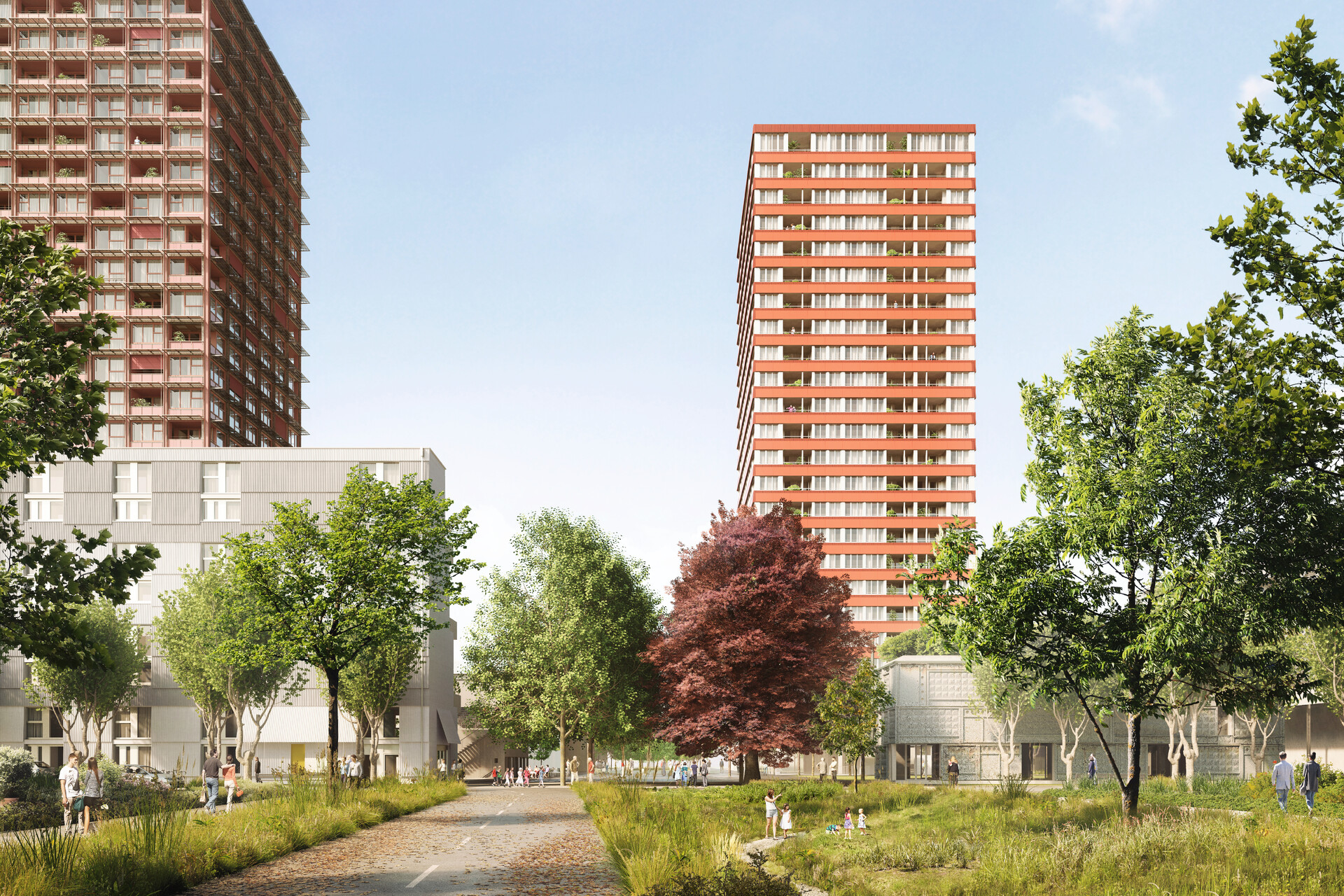 Das städtebauliche Konzept von Studio Märkli umfasst sieben Gebäude: zwei rostrote Hochhäuser – die das Quartier von weitem prägen werden –, ein Gewerbebau, ein Querbau mit Wohnungen sowie eine Loggia mit Doppel-Kindergarten, ein Längsbau und zwei Pavillons mit zum Teil öffentlicher Nutzung. Umgesetzt werden sie vom Studio Märkli gemeinsam mit Boltshauser Architekten, Graser Troxler Architekten und Lütjens Padmanabhan.
